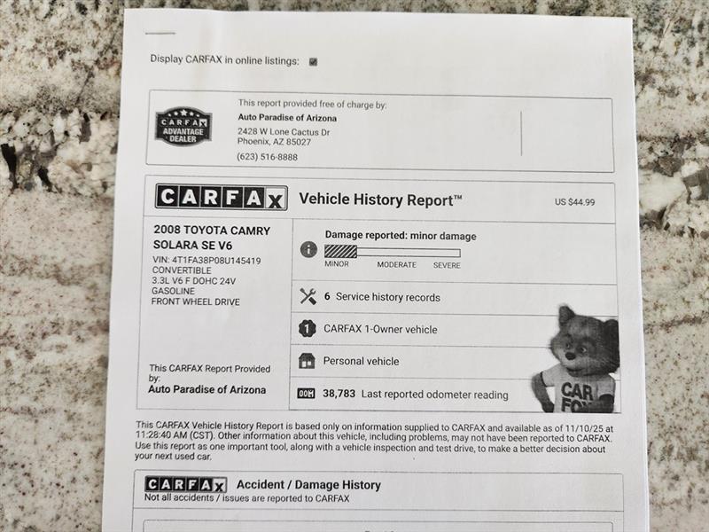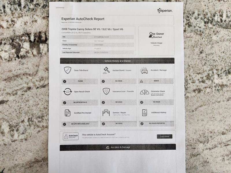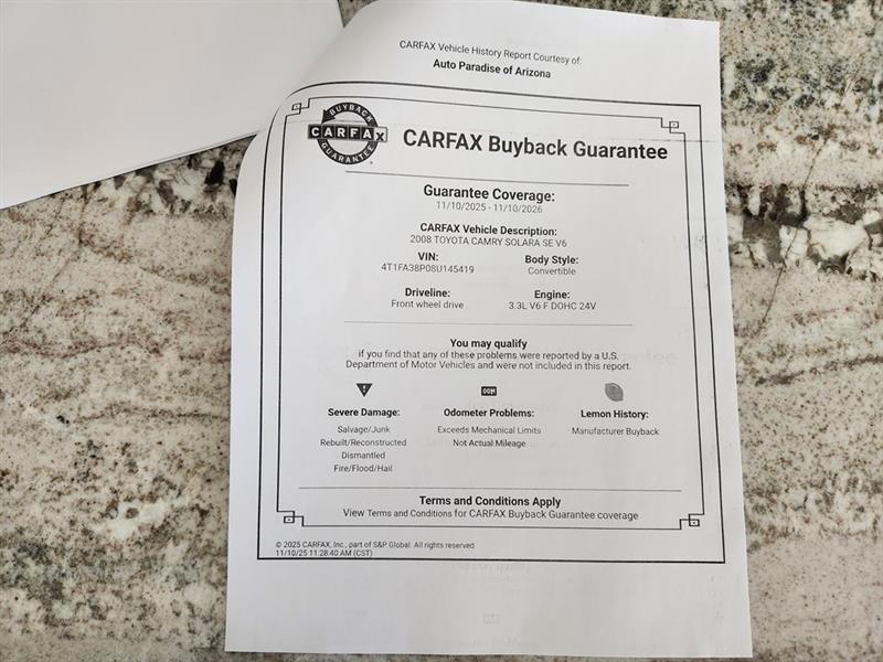 Vehicle Inquiry for 2008 Toyota Camry Solara SLE 2D Convertible V6